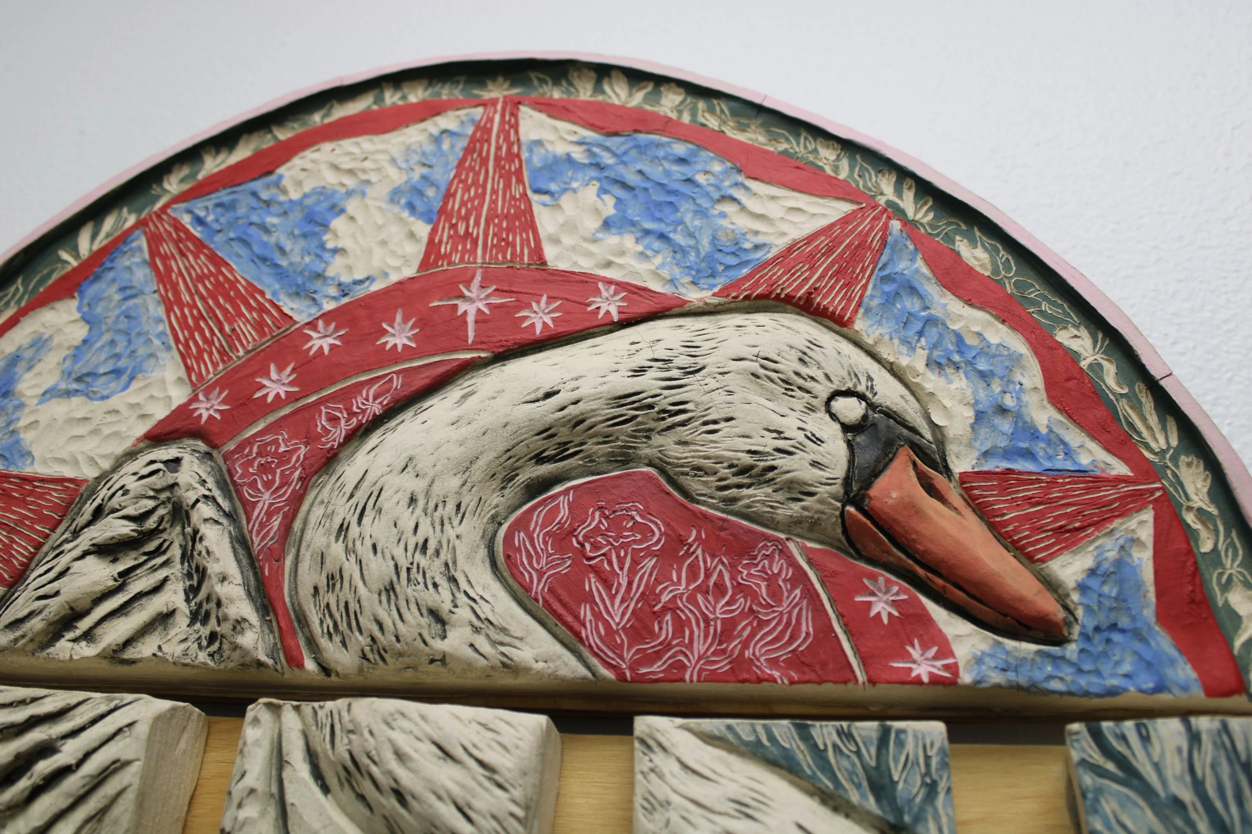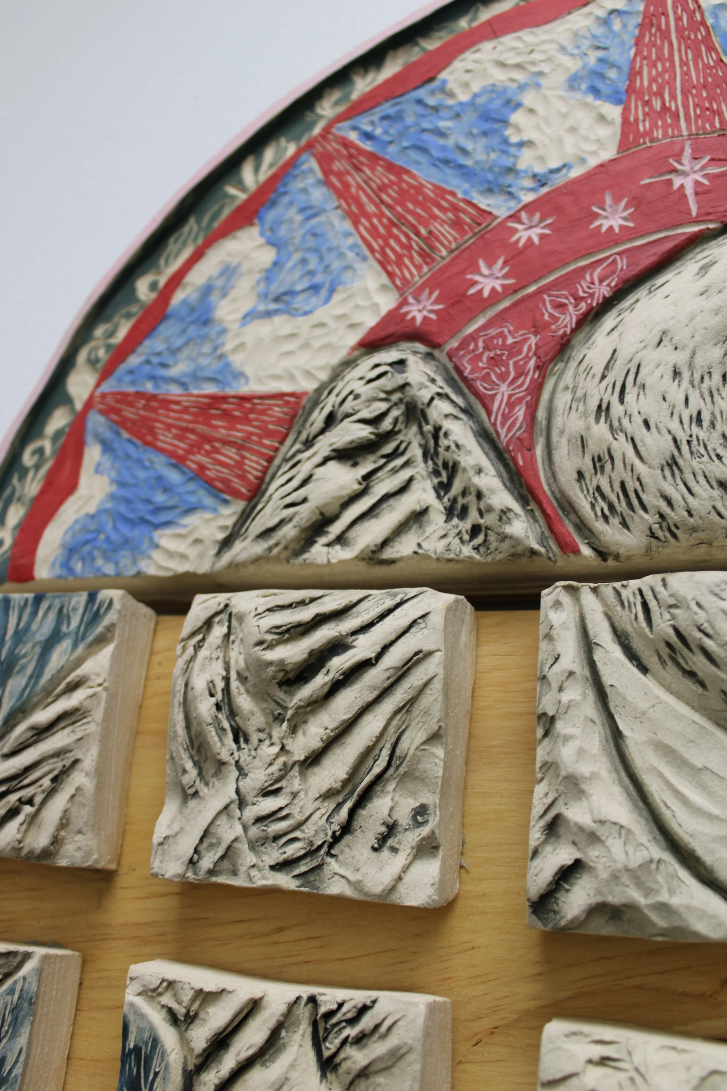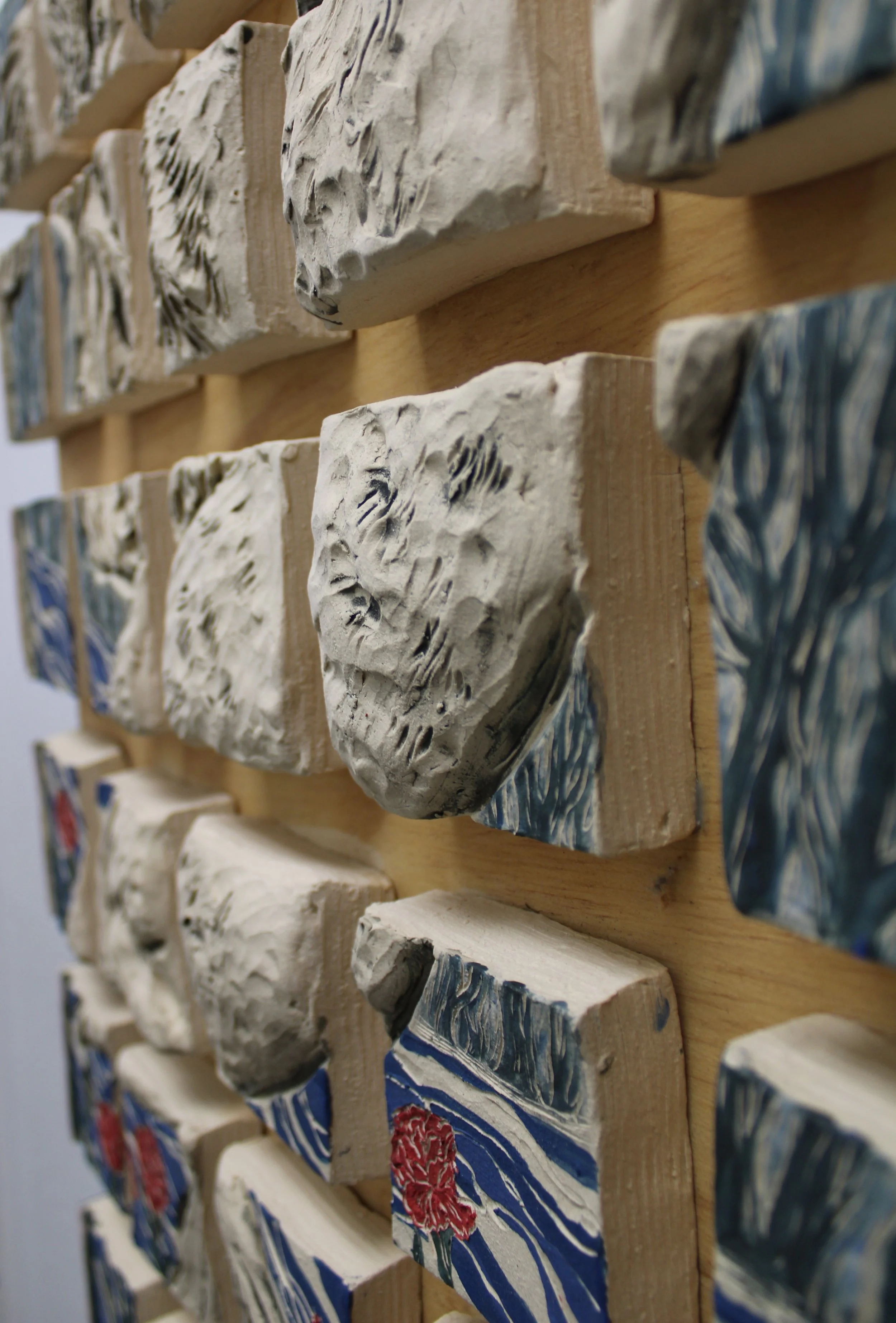 Precariousness of Life, 2022; ceramic, underglaze, wood; 48x22x2in